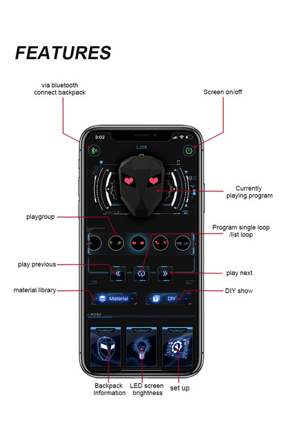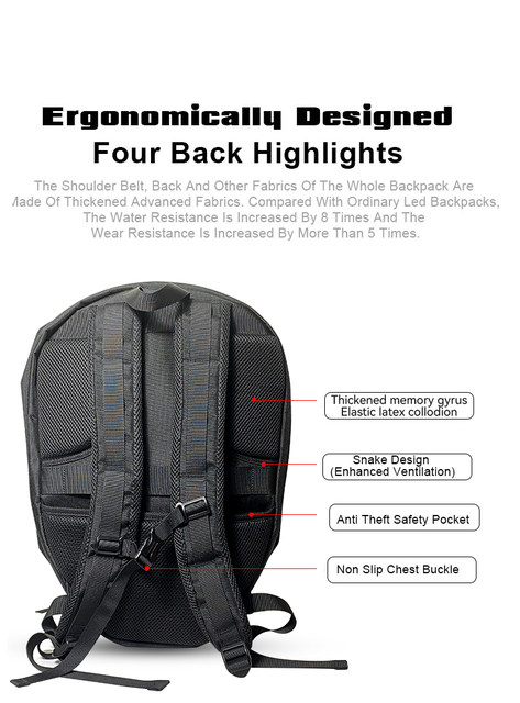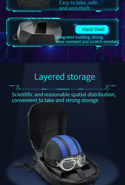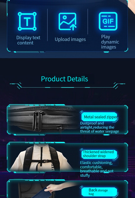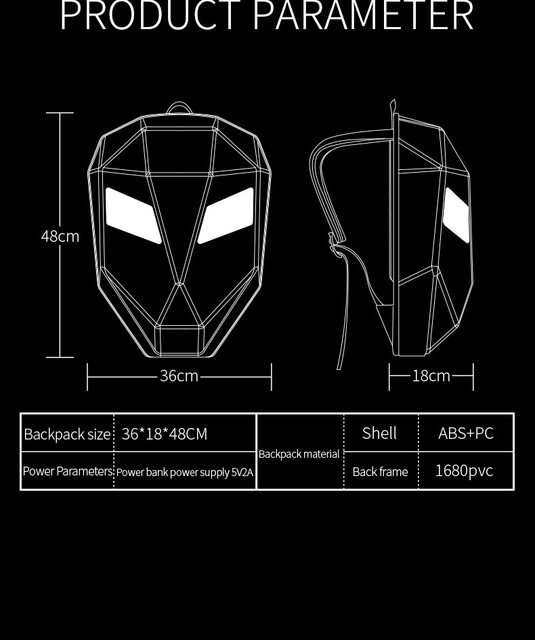 Matériau : ABS + PC Type de fermeture : Fermeture éclair et poulie Hauteur de l'article : 48 cm Diamètre de l'article : 18 cm Longueur de l'article : 36 cm Largeur de l'article : 18 cm Nom du modèle : sac à dos led Caractéristique 1 : Télécommande, écran LCD Caractéristique 2 : Étanche, avec USB Caractéristique 3 : Portable, anti-vol, avec écran LED Spéciales des caractéristiques : contrôle de l'écran LED **Conception innovante et fonctionnalité** Le sac à dos Loy Branded Colored Hard Shell 3D DIY Eyes Bluetooth Smart est une fusion parfaite de style et de technologie. Fabriqué en ABS et PC robustes, il offre une protection imperméable et durable pour vos affaires. Avec une fermeture éclair et poulie, il assure une sécurité optimale tout en permettant un accès facile. Les dimensions de 48 cm de hauteur, 36 cm de longueur et 18 cm de largeur offrent un espace généreux pour vos essentiels, tandis que le modèle nommé sac à dos led reflète son design distinctif. **Écran LED et contrôle intuitif** Ce sac à dos est équipé d'un écran LED interactif qui peut afficher des messages personnalisés, des noms, des numéros de téléphone ou des animations, grâce à la télécommande et l'écran LCD. La fonctionnalité anti-vol et portable, combinée à la capacité d'USB, rend ce sac à dos idéal pour les utilisateurs actifs et connectés. **Conçu pour les motards** Spécialement conçu pour les motards, ce sac à dos réduit la résistance à l'air et assure un confort de conduite. Son design épuré et son écran LED font un accessoire remarquable pour les motards, ajoutant une touche de style et de sécurité à leur équipement de conduite.
